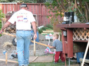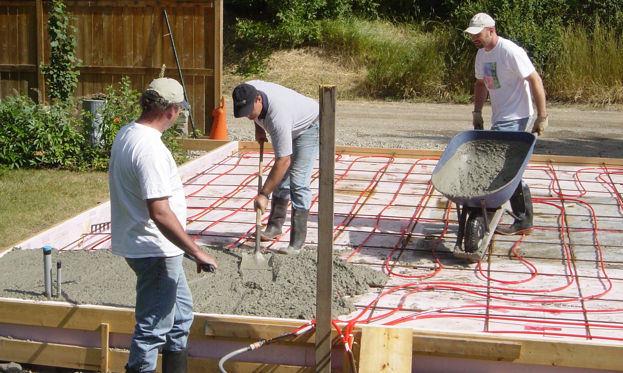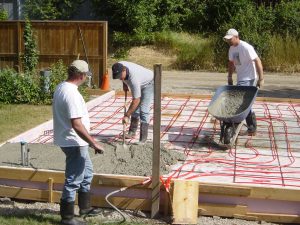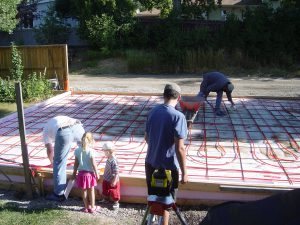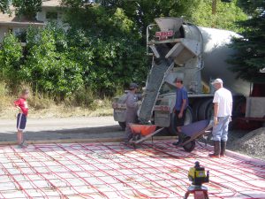 Before you can pour cement you will want to pressurize the in floor tubing so it won’t get crushed when people or the wheelbarrows go over it. I had read different suggestions, but we ended up just presurizing with water. It was easy to do using our tap water at about 60 PSI. The other benefit was if you had a puncture anywhere while working it would be quite obvious so you could fix it right away before the cement sets. Lots of sites suggest air, but of course you would need to watch the gauge, and you would have to try and find it.