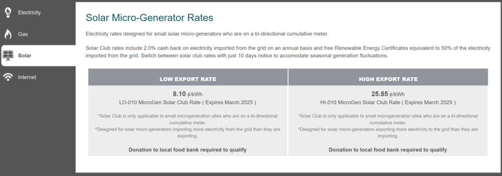 A local Cooperative that serves the foothills of Alberta. They have normal energy plans and a Solar Club plan you can see below.